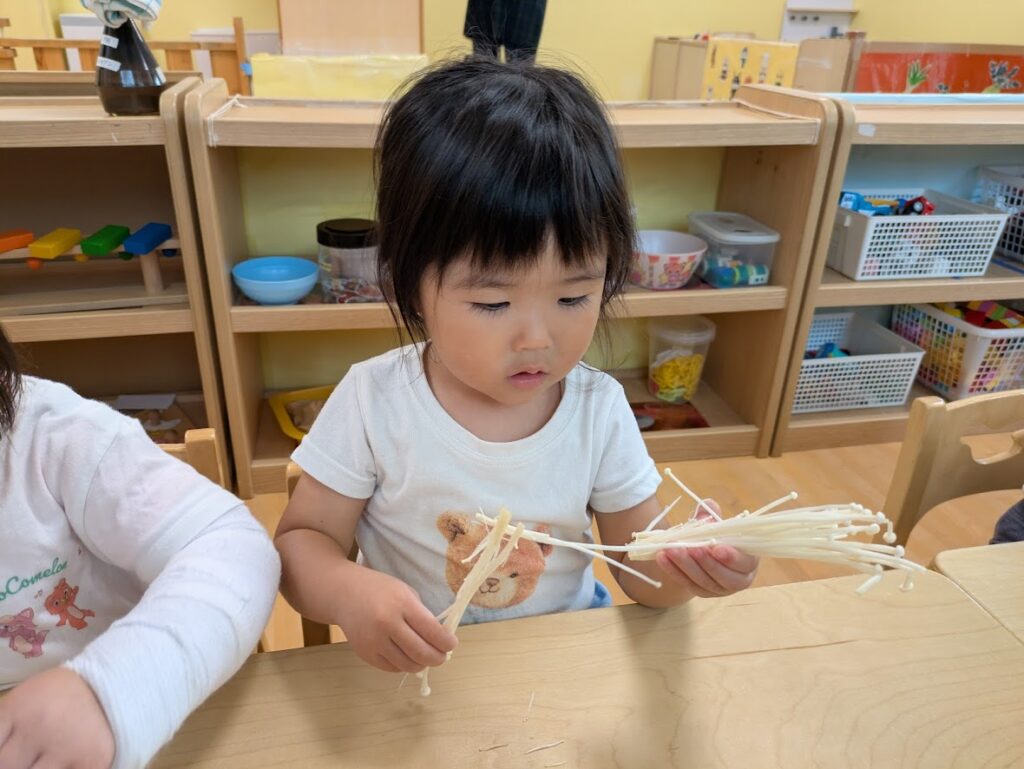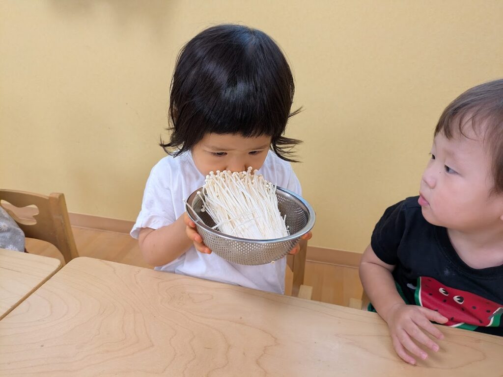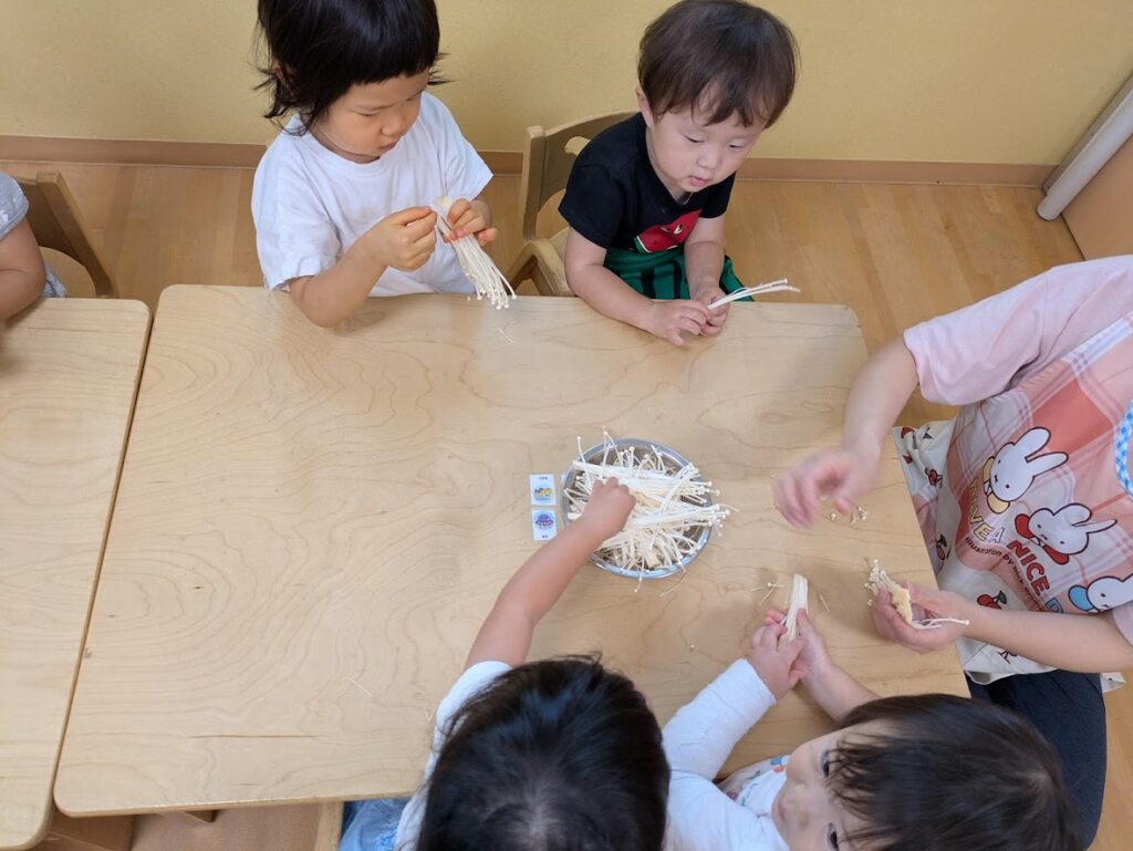 みんなでえのきをほぐしてザルの中がいっぱいに✌