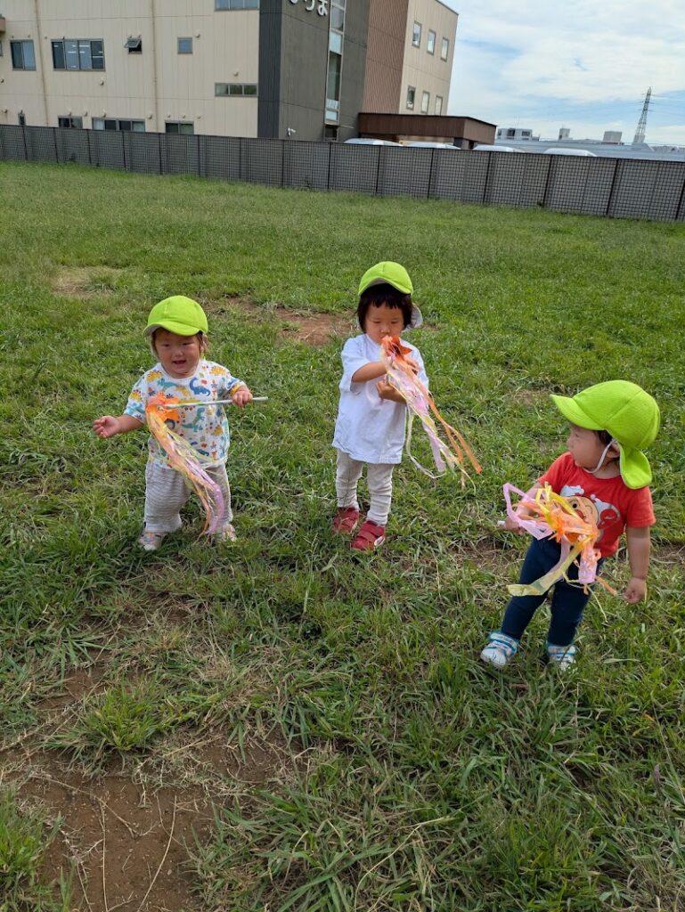 出来上がったステッキを持って公園へ行くと、「きれいだね!」と友達と話をしながらたくさん振って楽しんでいました✨