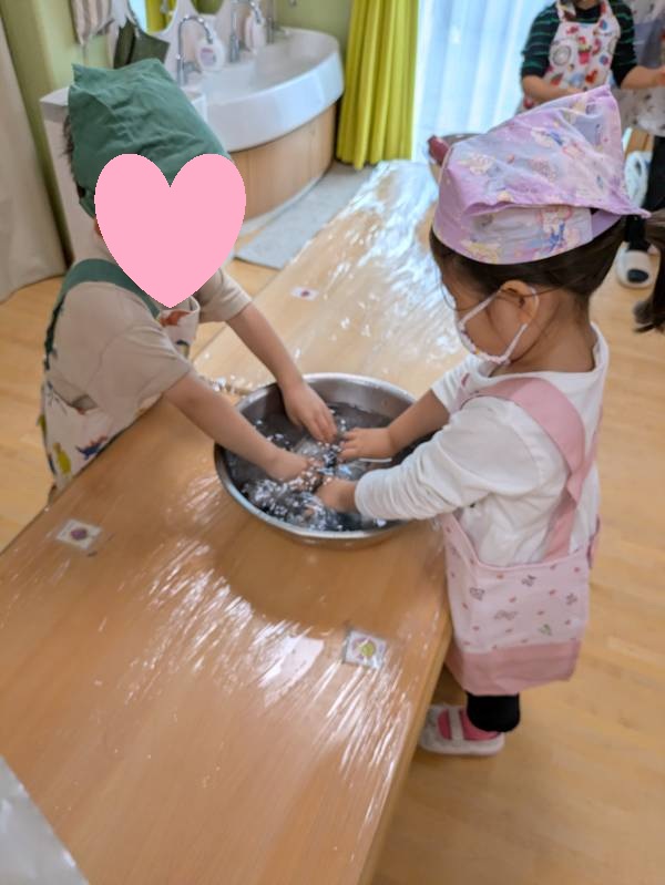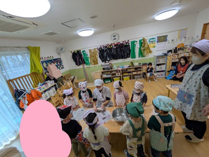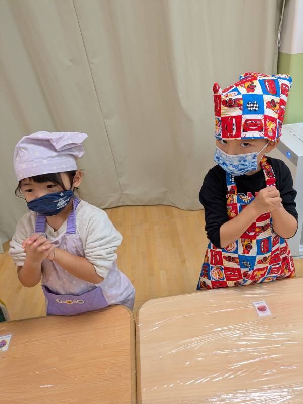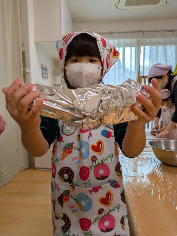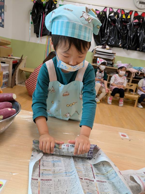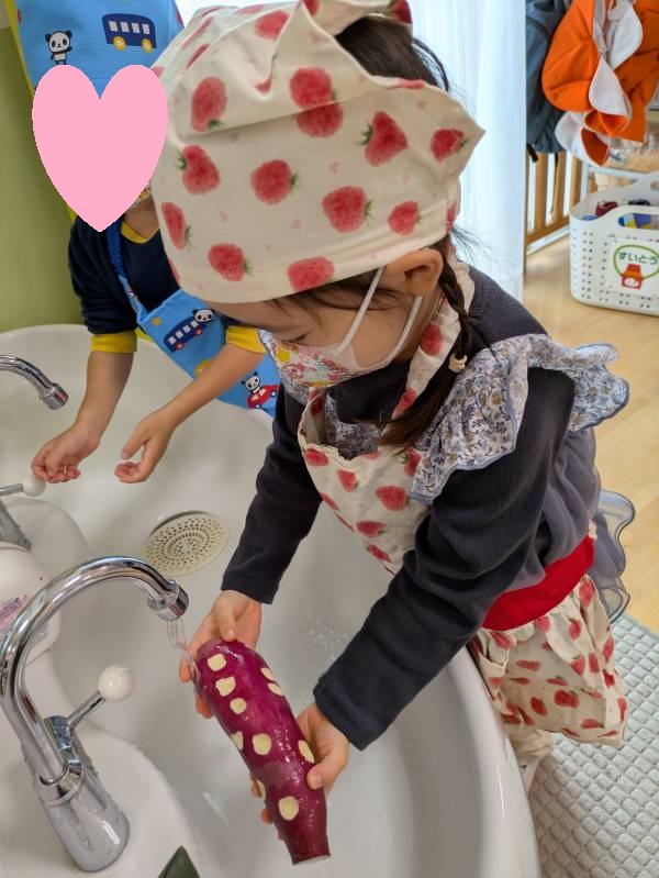 さつま芋の美味しい季節になりましたね😊先日、食育で焼き芋作りのお手伝いをしました。手を丁寧に洗って身支度を整え、洗った手が汚れないようにお祈りポーズで栄養士の先生を待ちました。