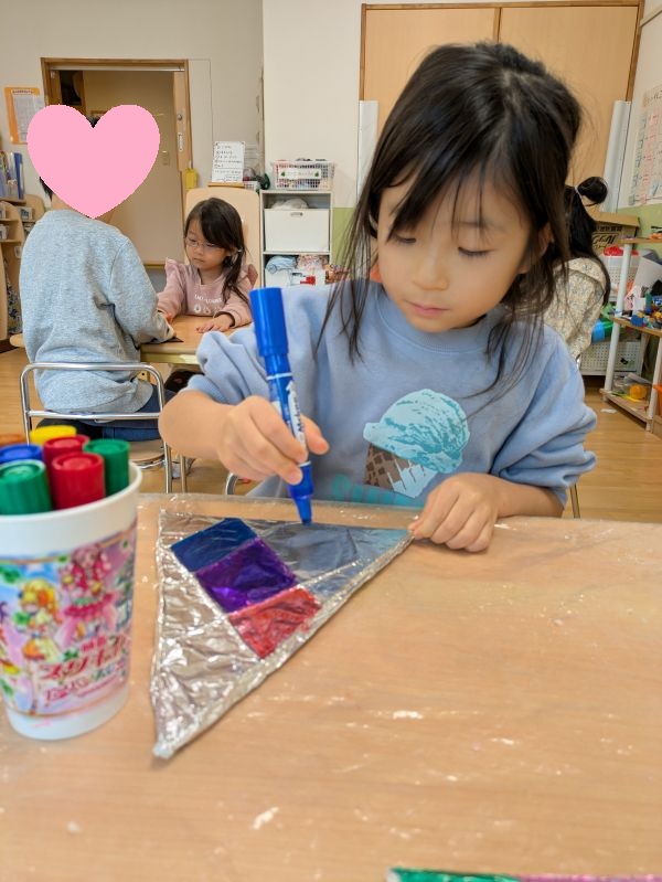 ペンで色を塗る時には、「星の形にした!」「虹みたいにしたよ!」と、浮かび上がった模様から色々な形を見つけて教えてくれました👀✨