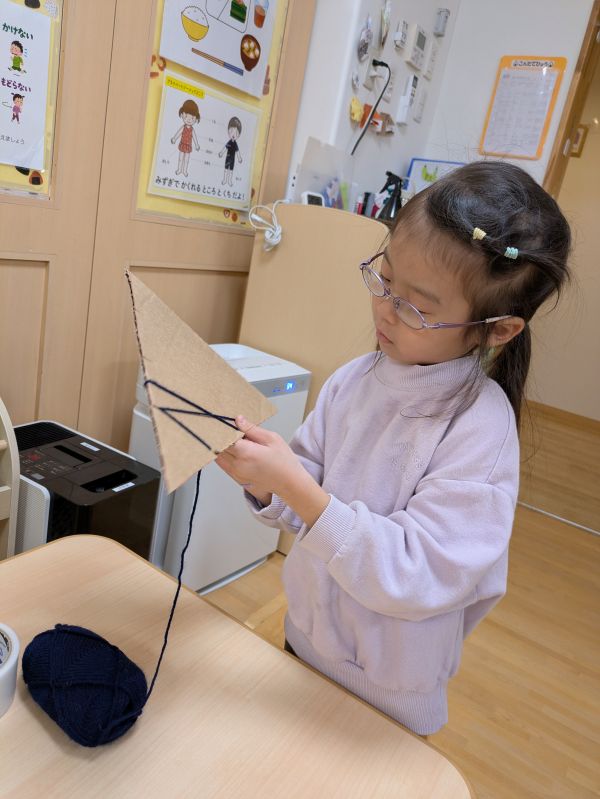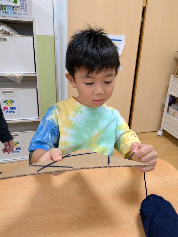 まずは、三角の切込みが入った段ボールに毛糸を巻いて、、、