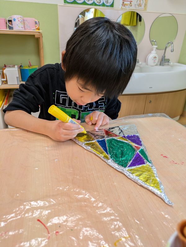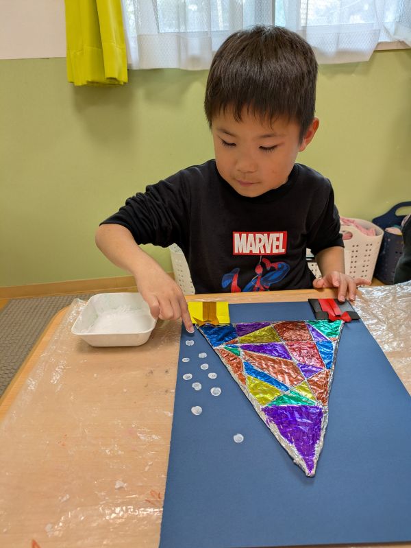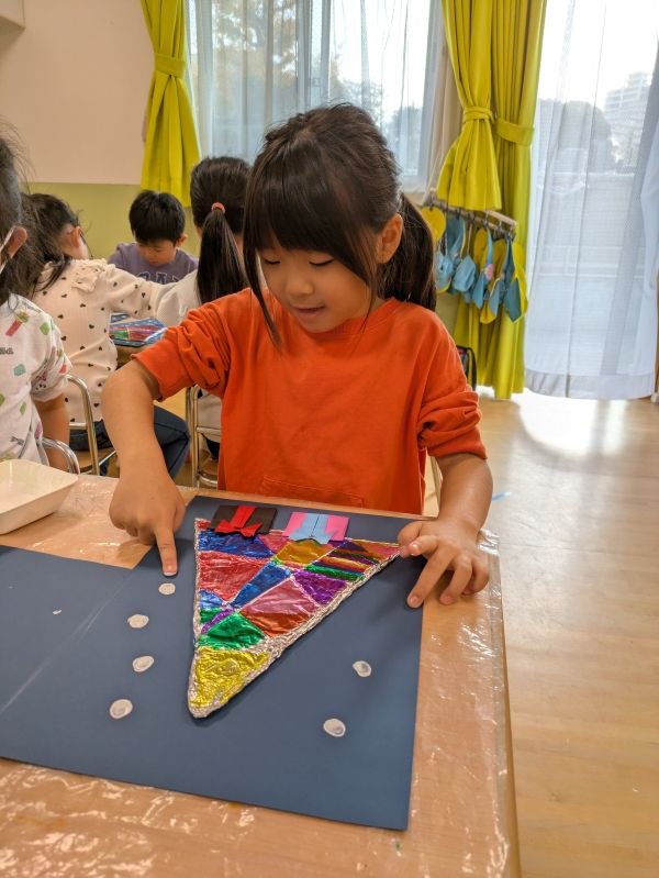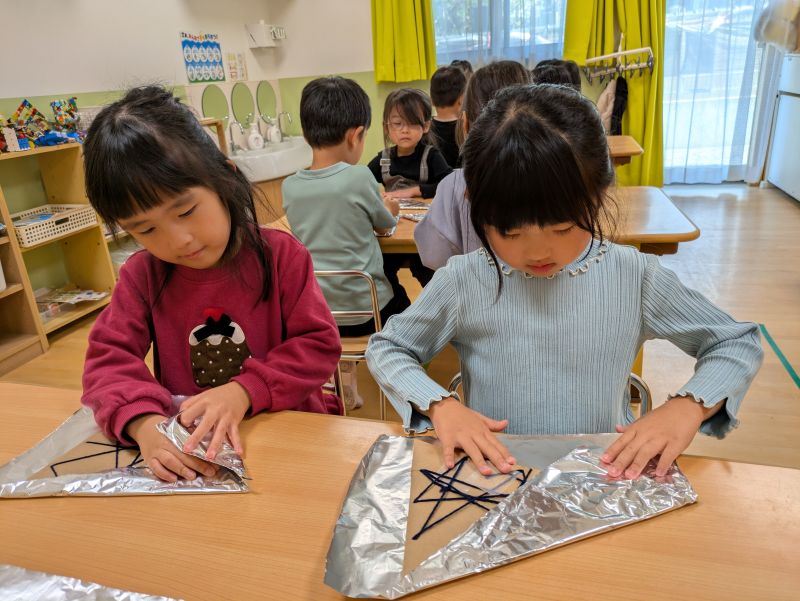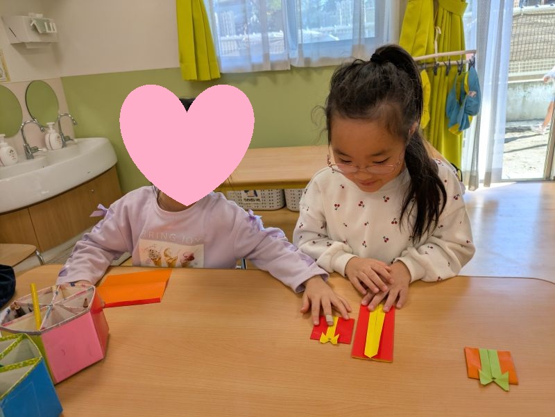 両面に色の付いている折り紙で、お友だちと教え合いながら折りました✨