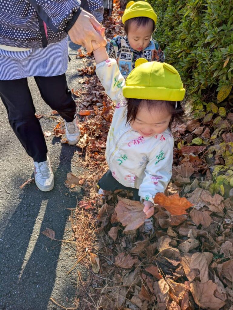 沢山ある枯れ葉を踏んでみたり、集めたり…手に取っておもいきり投げてみたりと冬の今しかできない遊びも楽しんでいました。