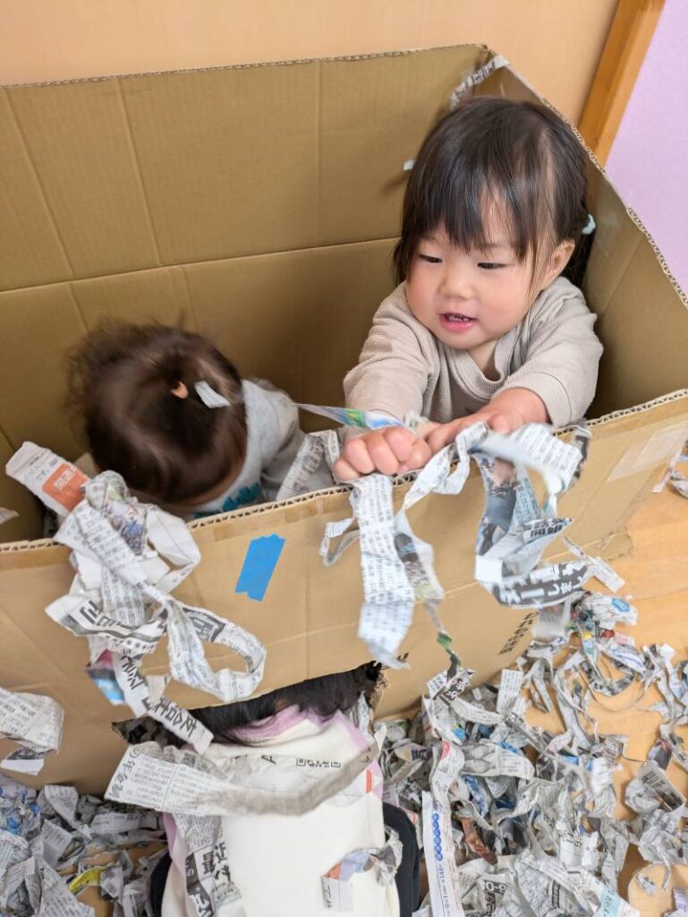 お部屋では、大好きな新聞紙や段ボールで豪快に遊んだり、
