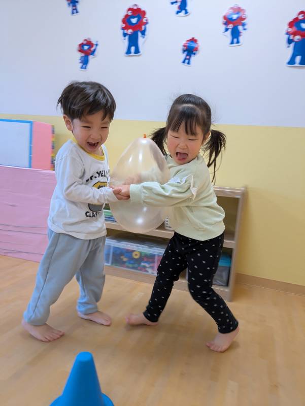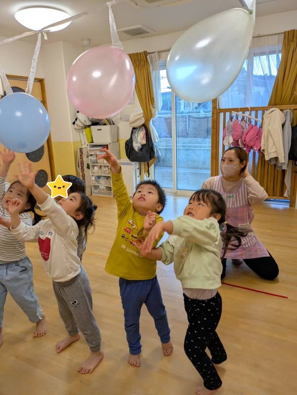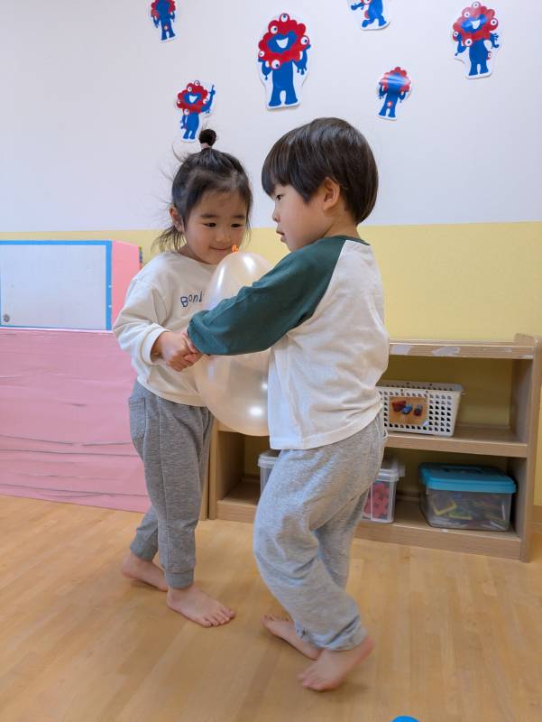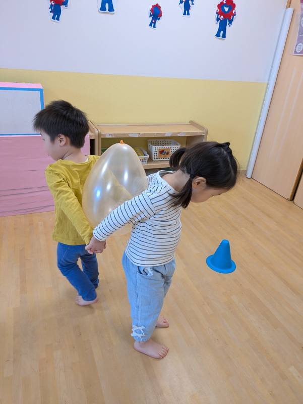 後ろ向きで手を繋ぐので少し難しかったですが、風船を落とさないよう一生懸命頑張っていましたよ☆