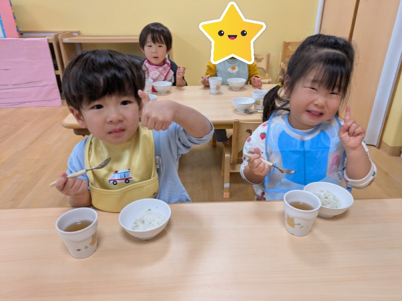 七草粥はおやつとして出ました♪「これさっきの葉っぱのやつ?」とおかゆに入っている七草をじっくり見ていました!