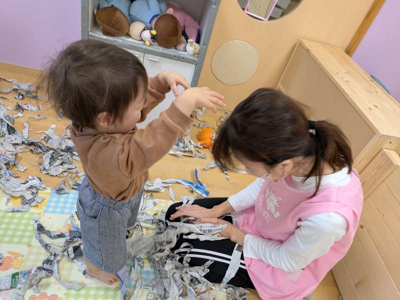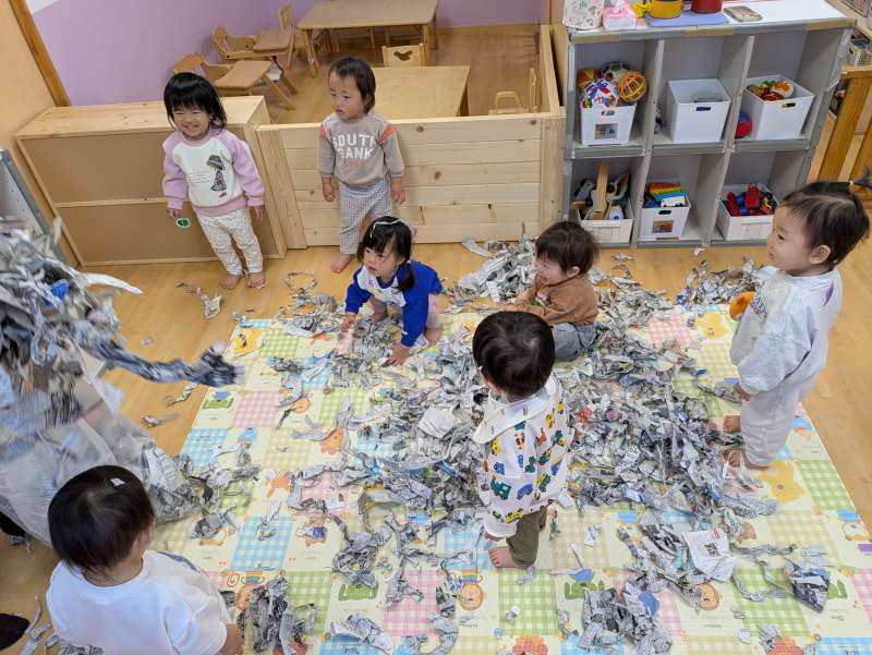 新聞紙を沢山抱えて運んで行ったり、細かくちぎってみたりと楽しみ方はそれぞれ。