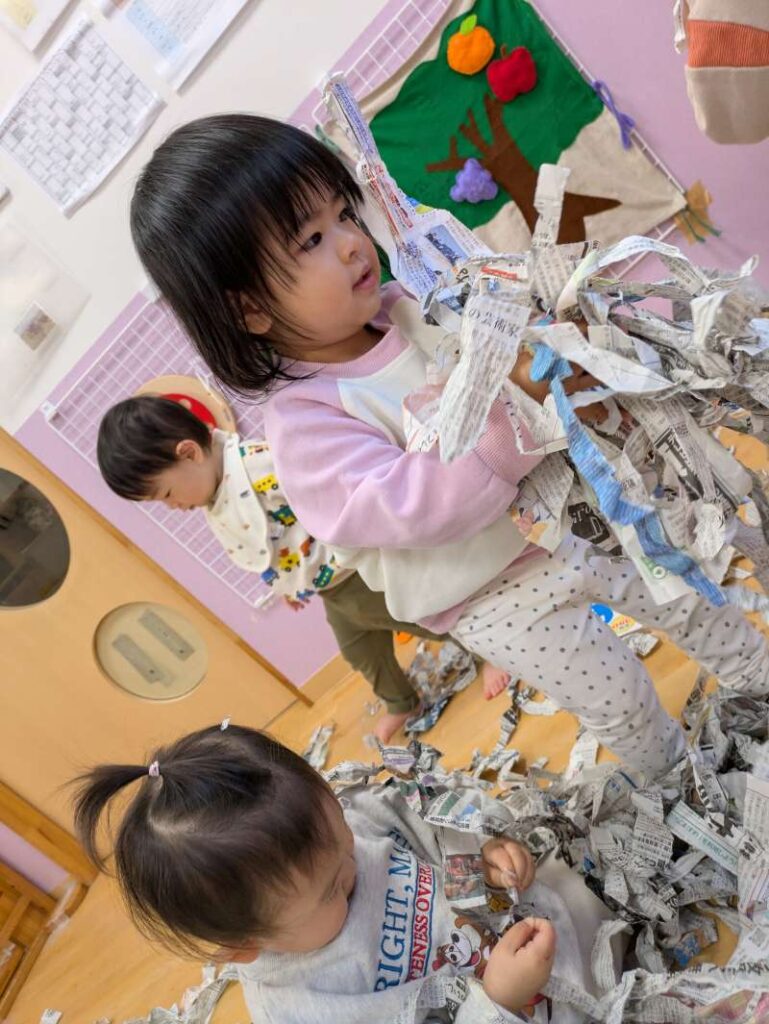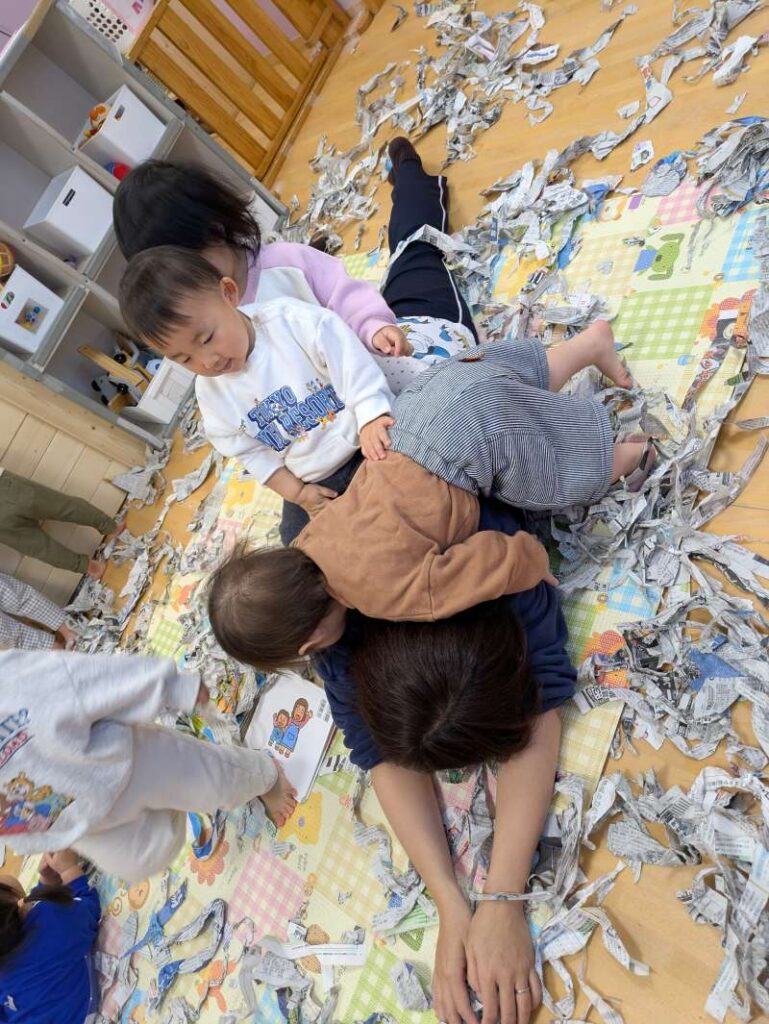 新聞紙に埋もれていた保育者にも乗ってみたりと身体もたくさん動かして遊んでいましたよ🌟