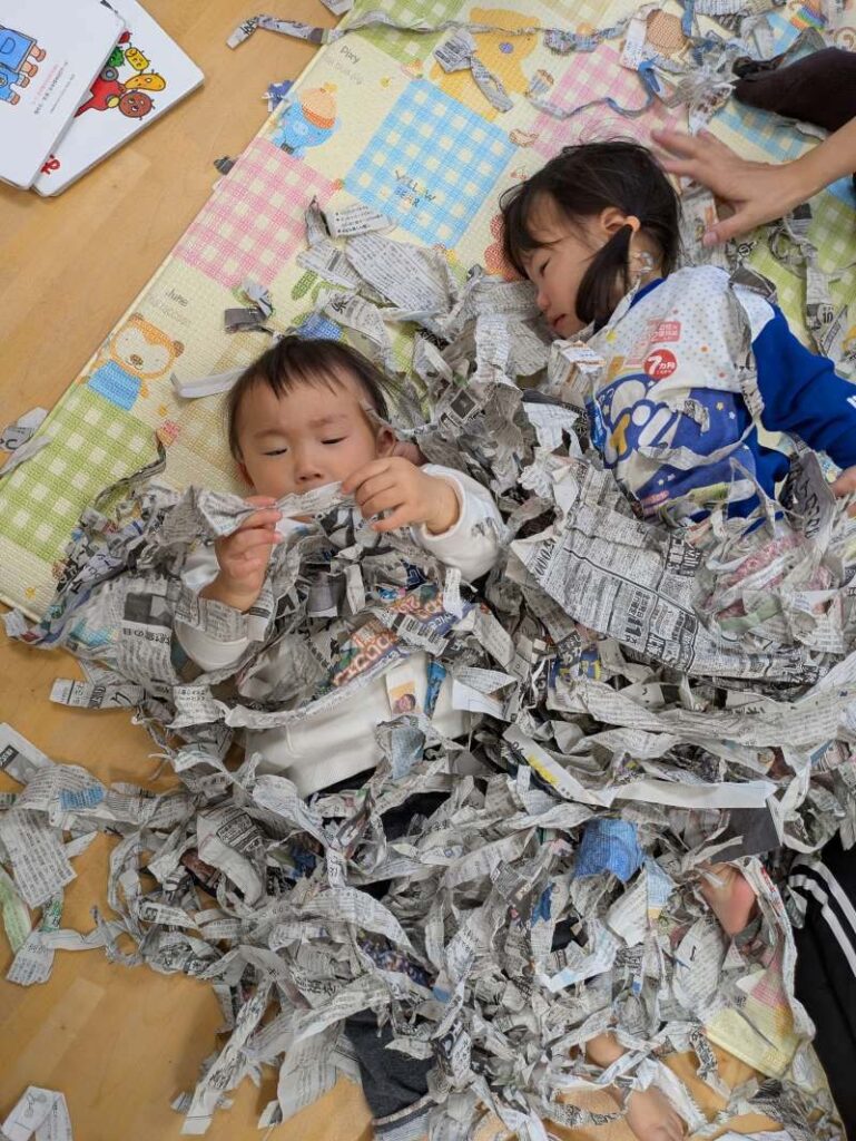 後半はリラックスタイム♪静かに新聞紙に埋もれながらお友達と喃語で話をしたり、ゴロゴロしながら新聞を千切ったりする子どもたちでした😊