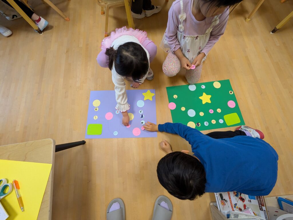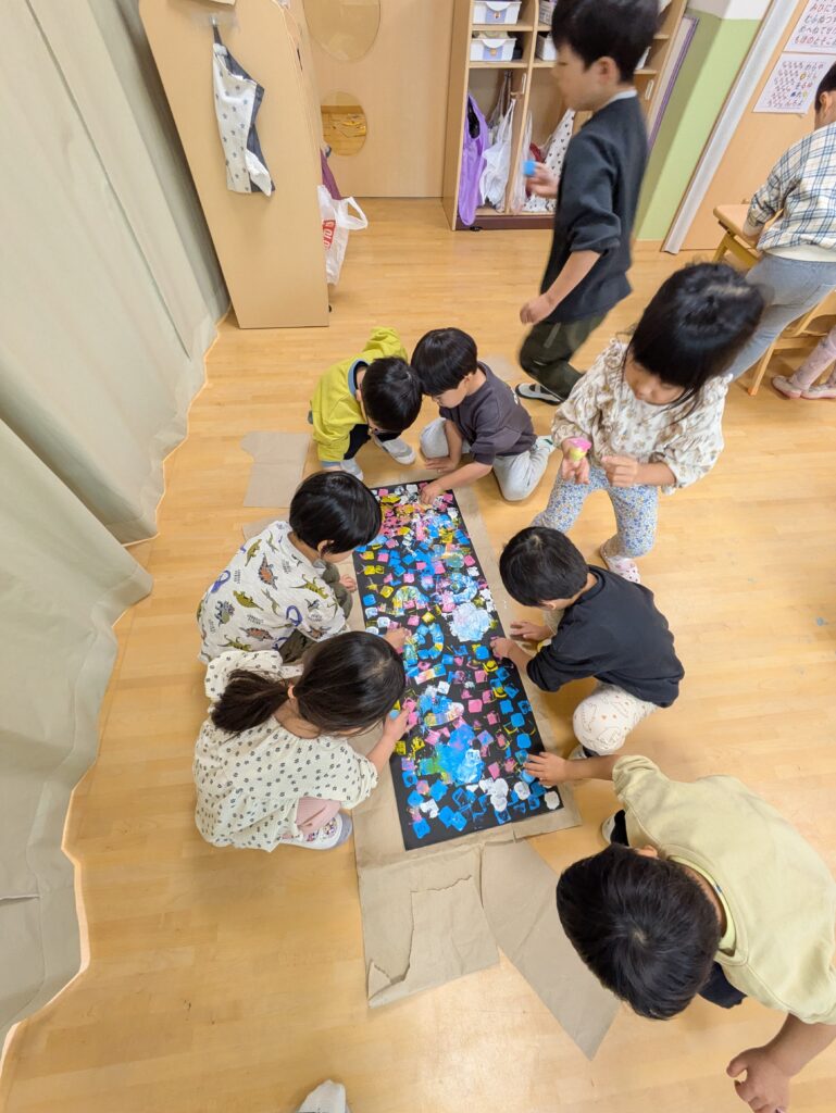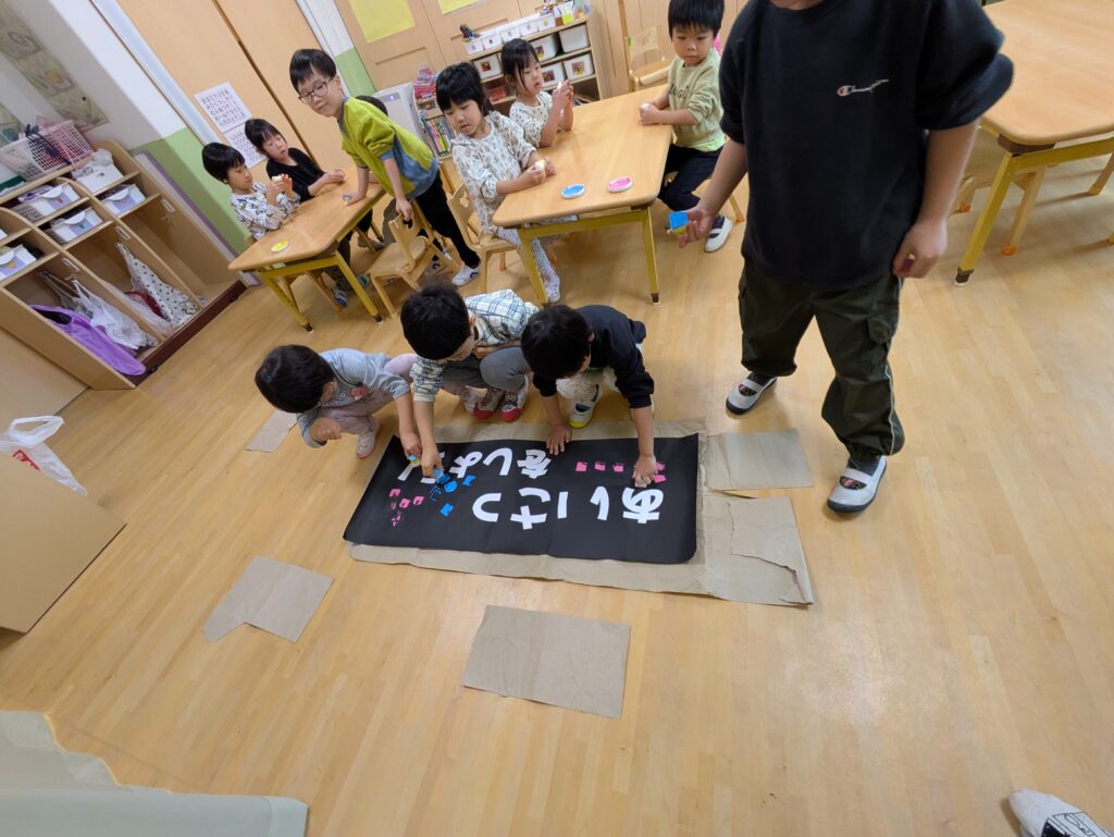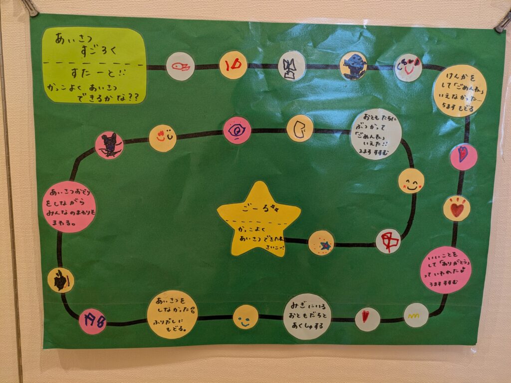 「いただきます!を言わないで食べちゃった!1回休み」や「あいさつおどりをしながらみんなの周りをまわる」「お友達とぶつかってごめんね言えた!2マス進む」などさまざまなミッションの案を出してくれました✨何もないマスにはみんなで好きな絵を描いて貼りました😊