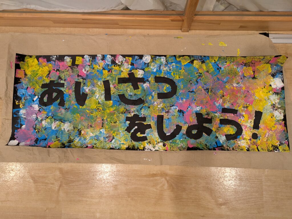 ポスター作りでは、黒い模造紙に【あいさつをしよう!】の文字を貼り、その上から絵の具でスタンピング♪最後に文字を剥がして完成💗
