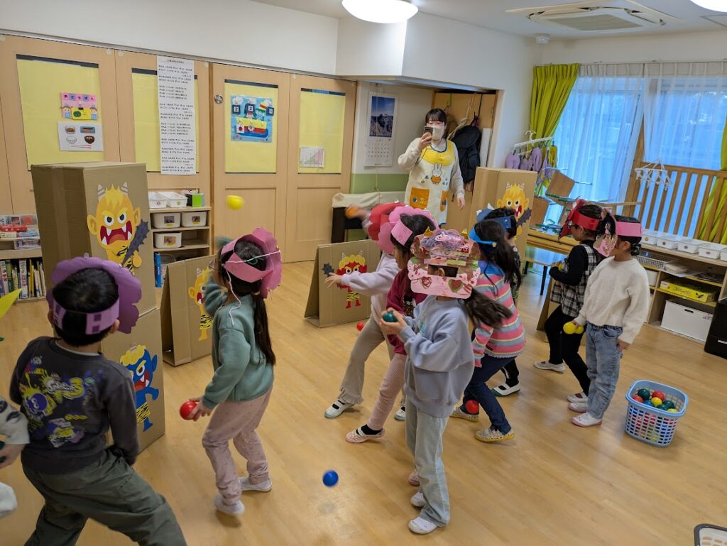 知らない間に鬼が部屋の中に!ドキドキしている幼児さんでしたが、みんなで力を合わせて「鬼はそと~」とボールを投げて無事鬼を退治してくれました👏