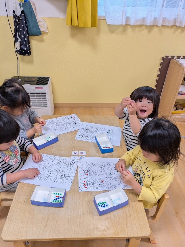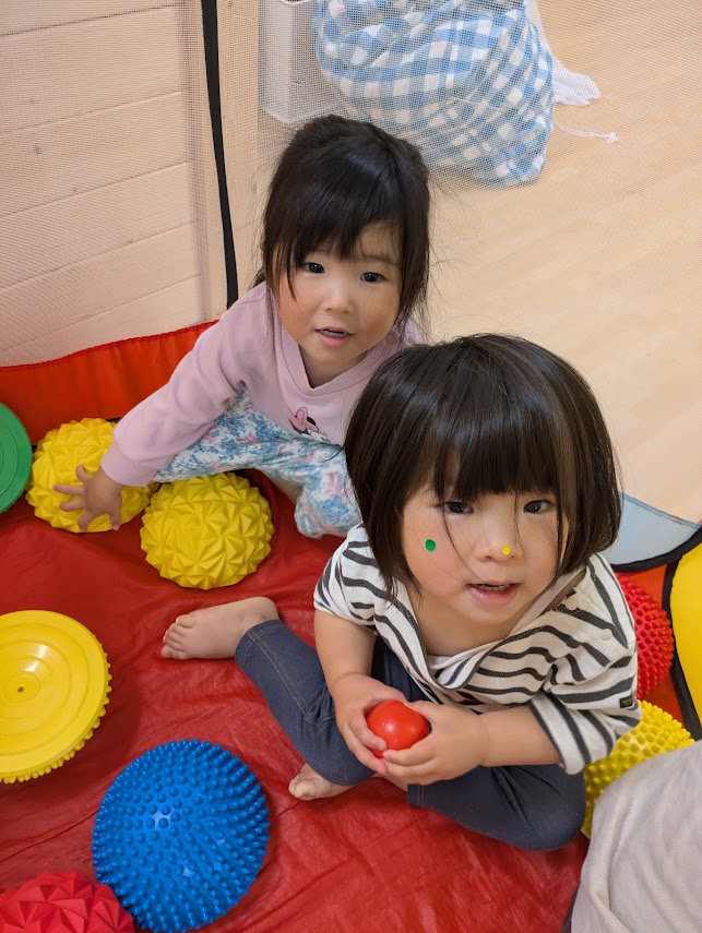 シール遊び後のテントの中を覗くと・・・👀顔にシールを付けながら遊んでいる所を発見!