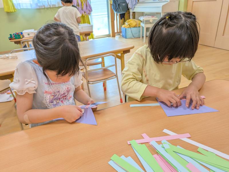 編み込む画用紙の色も自分たちで決め、二色にしている子や全色にしている子と様々でした。